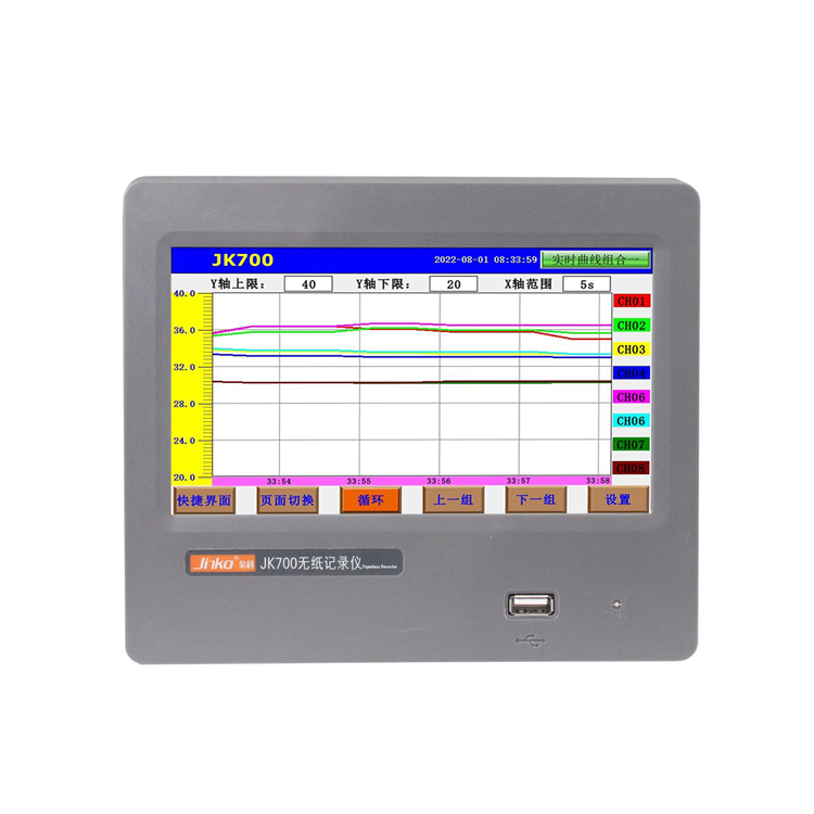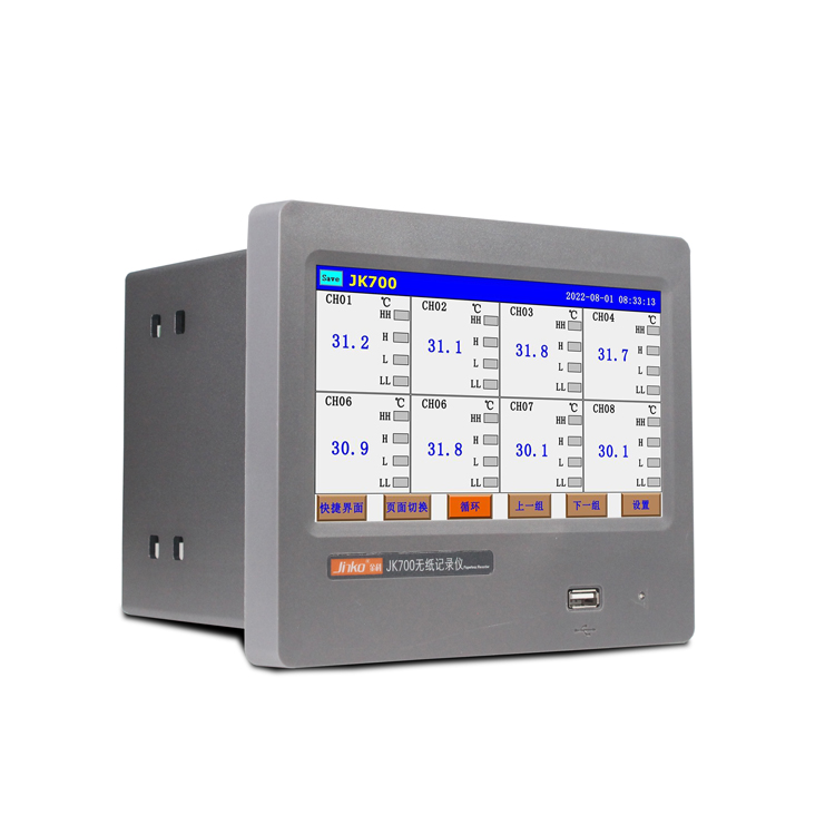 JK700彩屏無紙記錄儀,可輸入標準電流、標準電壓、數字式、熱電偶、熱電阻等還增加了NTC測量,以先進的CPU為核心,基于智能化、數字化、網絡化設計思想,輔以大規(guī)模集成電路、JK700無紙記錄儀是將采集的數據/運算數據以時間為基軸記錄在儀器內部的存儲系統(tǒng)中,再把內部的存儲數據,通過運算、模擬后顯示在液晶屏。常用顯示液晶屏比較廣泛。在液晶屏屏幕上,可以顯示數字顯示、棒圖顯示、曲線顯示、報警列表等。7寸液晶觸摸屏面板直接操作,無需多層菜單按鍵切換,具有方便,快捷的特點。大容量FLASH存儲、信號智能調理、SmartBus總線以及高分辨率圖形液晶顯示器的新型智能化無紙記錄儀。JK700可以高精度測量?,采用高精度傳感器、能夠準確測量電流、電壓等數據,電壓分辨率1μV,精度可達0.01%并具有自動校準功能,確保數據準確性??實時曲線記錄?:能夠實時記錄電壓等數據的變化曲線,用戶可以通過曲線圖直觀了解數據變化趨勢,同時支持多種曲線同時顯示,方便對比分析?具有傳感器隔離配電輸出、繼電器報警輸出、變送輸出、流量積算、溫壓補償、歷史數據轉存、打印以及無線遠程通訊功能。另產品具有體積小、通道多、功耗低、精度高、通用性強、運行穩(wěn)定、可靠性高等特點,已廣泛應用于食品醫(yī)藥、科研生產、科教、環(huán)保、實驗(測試)室、電力、冶金、石化、石油、化工、建材、造紙、印染、釀造等行業(yè)。